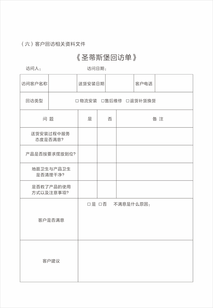 告别之前:告知客户圣蒂斯堡全国免费服务电话(售后服务贴)以及保修方式,请客户在《产品配送单》上签名,并填写《配送满意度调查表》后,合影留念。