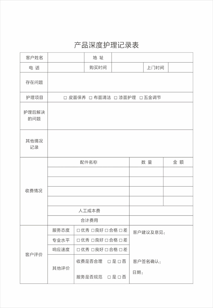 按要求认真填写服务记录单据并请顾客填写相应内容及签字,离开顾客处时除了与顾客本人告别外,还需要向有关负责人打招呼,询问是否还有其他问题,当得到顾客的满意允许后,方可离开。