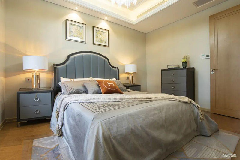次卧高床屏由金属镶嵌,呈现简约有序的线条,雾霾蓝床屏与浅蓝朦胧装饰画,窗帘相呼应,色泽搭配和谐自然,无不透漏着一种简洁大方视觉体验。