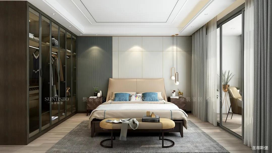 次卧的对称极简主义让人拥有奢华、简约居家质感。倒梯形的几何床头柜和奢华的水母造型床头灯,都让空间散发着华贵的魅力。嵌入式的立面衣橱,运用不同的材质将极简的协调效果达到极致,收纳空间层层分区,让每一件物品都有迹可循。